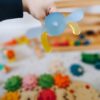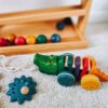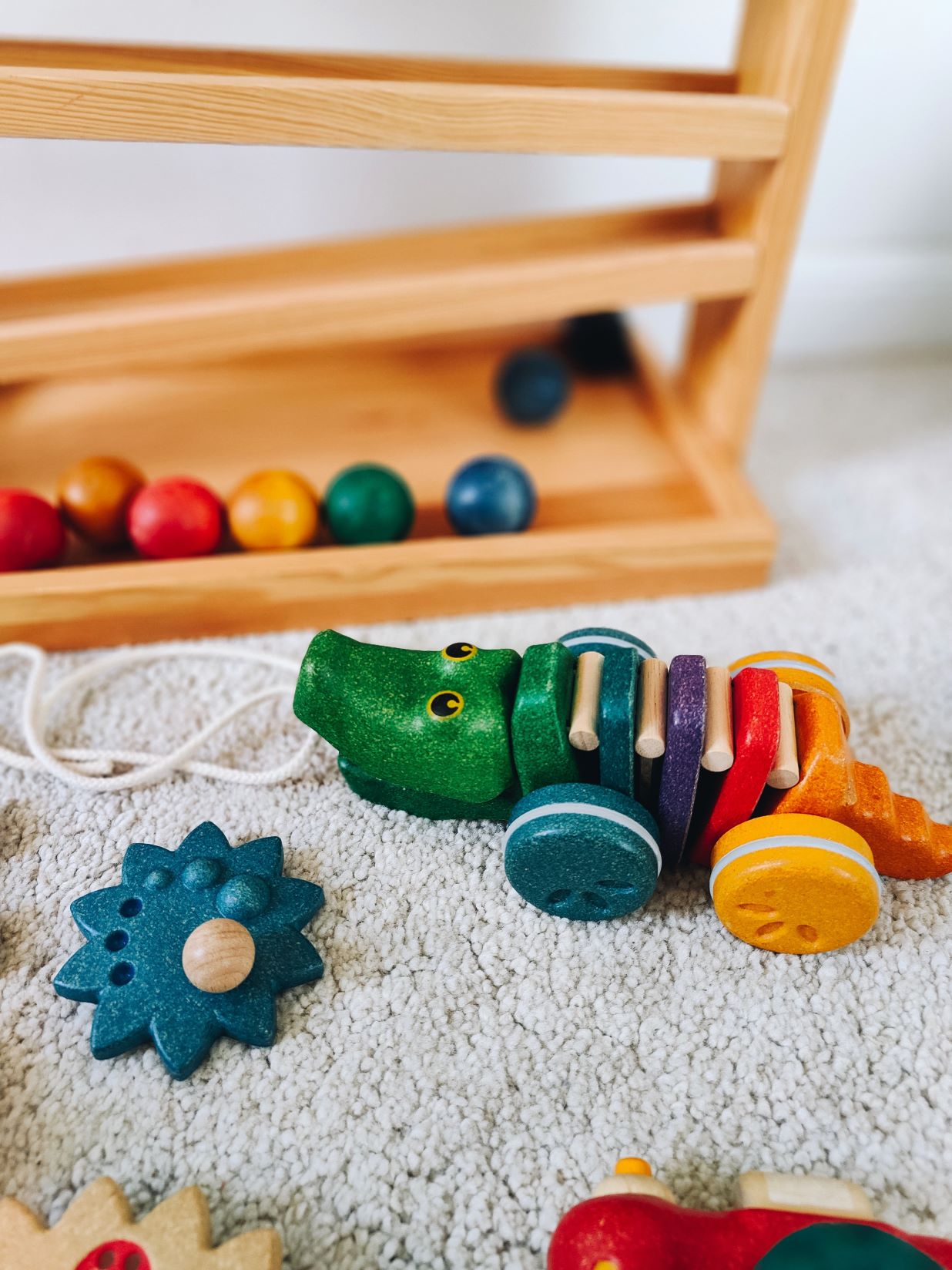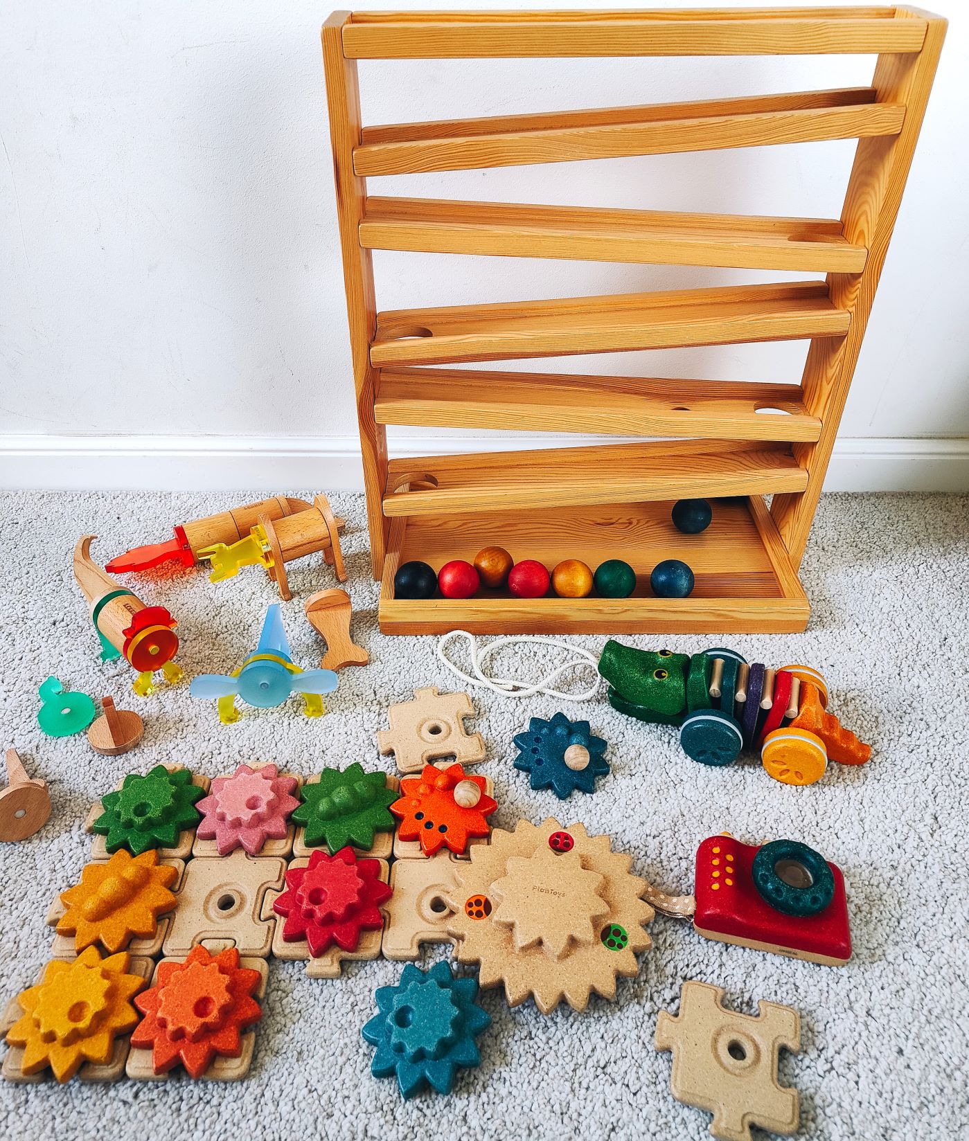 Skład zestawu: drewniany tor kulkowy Polana Montessori, koła zębate Delux marki Plan Toys, klocki magnetyczne Lekkid, aparat Plan Toys, kolorowy krokodyl Plan Toys.