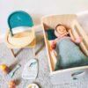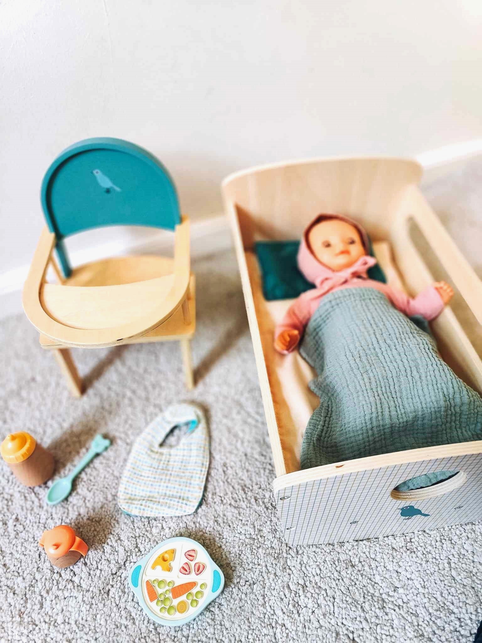 Skład zestawu: drewniana kołyska marki Djeco, lalka Pomea marki Djeco, krzesełko do karmienia Djeco, zestaw akcesoriów do karmienia marki Djeco