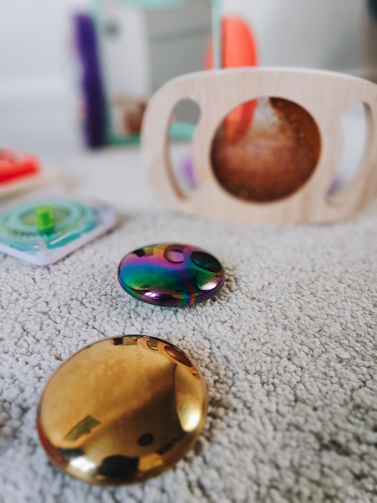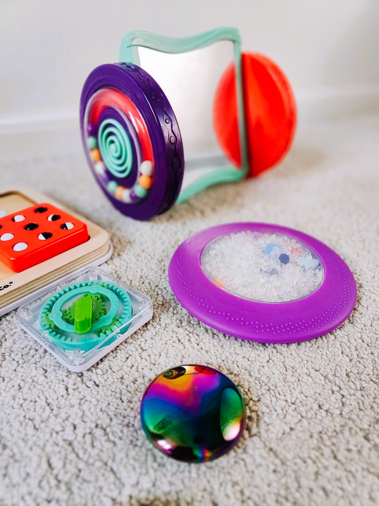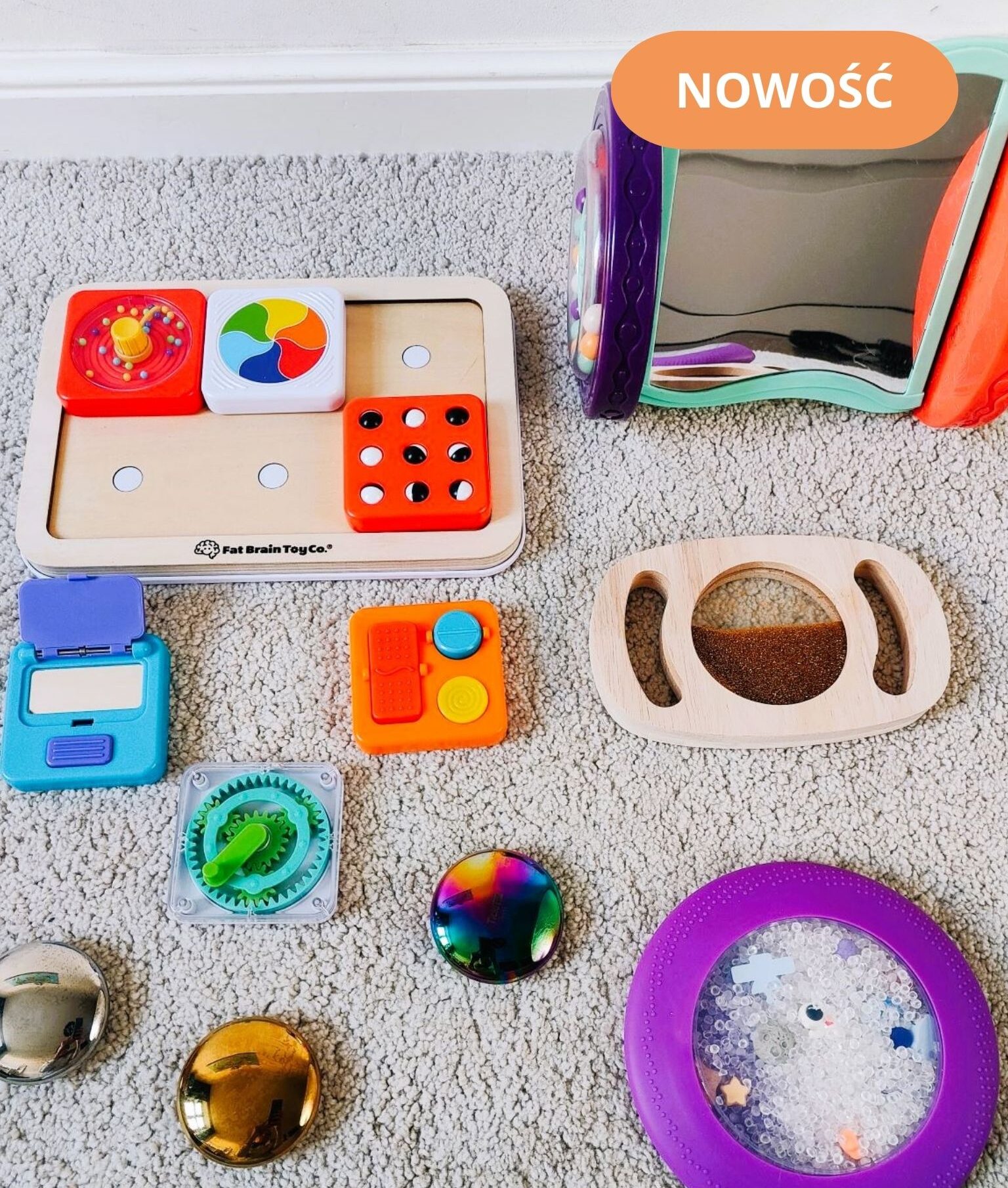 Skład zestawu: lusterko Looky Looky marki B.Toys, tablica modułowa magnetyczna PlayTab, dyski ze stali nierdzewnej Tickit, panel brokatowy marki Tickit, dysk sensoryczny Kosmos Akuku.